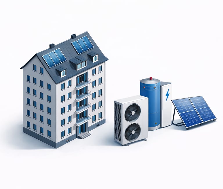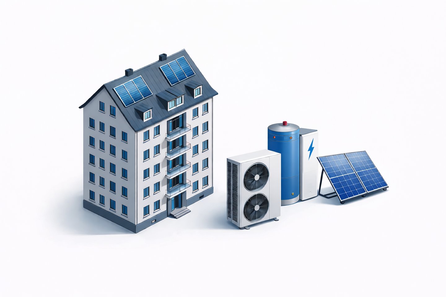Each renovation installs a standardized energy system architecture — combining solar generation, heat pumps, storage, and digital smart management.